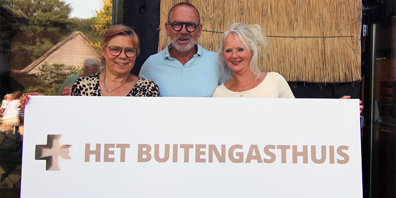 Tijdens een vrolijke buurtbijeenkomst in Meppen is het logo onthuld van Het Buitengasthuis door Joske Boom, verzorgende IG en Aaltje Post, verpleegkundige.