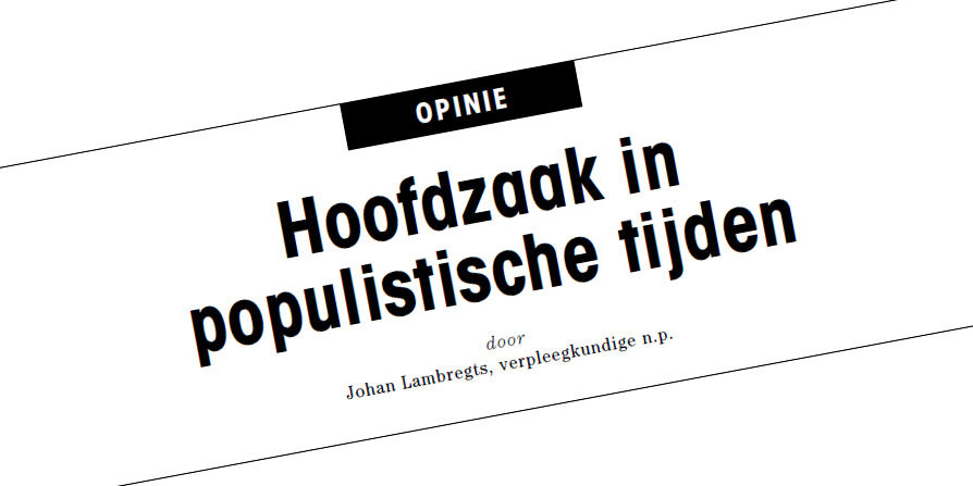 niet te veel met ‘het hoofd’ bezig zijn en te weinig met ‘het hart’. Sabine heeft vast de beste intenties, maar populisten kunnen aan de haal gaan met zo’n uitspraak. Ik heb het over hen die verpleegkunde beschouwen als iets waarvoor vooral genoeg ‘handen’ aan het bed nodig zijn. En denken dat ‘als je maar lief bent (hart) voor patiënten de zorg goed is’. De begrippen ‘denken’ (hoofd), ‘doen’ (handen) en ‘voelen’ (hart) helpen verpleegkundigen niet vooruit. Een goede verpleegkundige werkt niet alleen vanuit het hart, maar weet wat ze doet en waarom. Daarbij luistert ze naar de behoefte van de patiënt. Vervolgens bepalen zij samen wat het ‘goede’ is. Dat gaat niet zonder reflectie. Daarom ben ik het niet eens met de uitspraak dat ‘we met alle wetenschappelijke bagage, ons handelen laten sturen met het hart’. Dat stelt het ‘voelen’ boven het ‘denken’. Dat lijkt me risicovol. We moeten zorgvuldig wensen en mogelijkheden van de patiënt afwegen met de beschikbare kennis. De uitspraak dat we ‘te veel doorschieten in de verwetenschappelijking’ kan ertoe leiden dat mensen zeggen: ‘Laten we terugkeren naar die goede oude tijd waarin verpleegsters niet hoefden na te denken, maar gewoon deden wat de dokter zei’. Gezien de toenemende complexiteit van zorg en schaarste aan personeel is juist meer wetenschappelijk onderbouwde kennis nodig en meer ‘hoofd’. ‘Hoofden’ die luisteren, coachen, met nieuwe kennis én een onderzoekende houding.